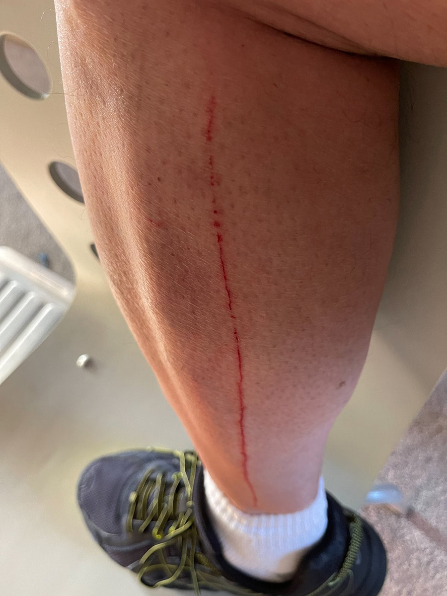 By the time I got home to Lanoka, with Friday night bumper to bumper Jersey shore summer traffic—it was after 7:00 PM. My three kitties were VERY happy to see me—and hungry—they hadn’t been fed since 6:30 AM when I left. One thing I’ve learned—my absence makes the Manx boy-cats turn into excited, happy, jumping-creatures on my return. I swear Rocco could earn a gold medal leaping, lunging, and high jumping in the Kitty Olympics! To watch him is a sight to behold. The boy can leap straight up, or lunge forward in a manner that can be gravity defying, entertaining and incredibly comedic—lest a human body part is in his flight path. Sadly, my left leg was in his flight path that evening upon returning home from my ER/Optho/traffic ordeal. You can see the result in the photos. Ouch!
