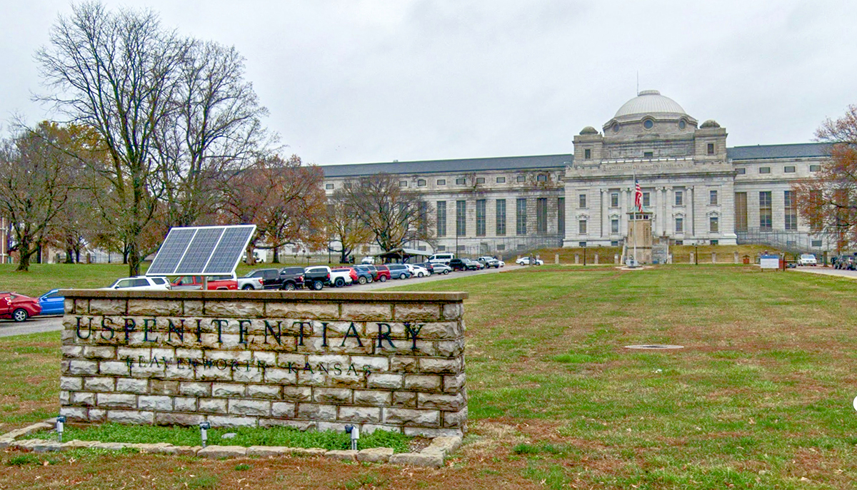 Solar panels on the ground in front of U.S. Penitentiary Leavenworth, Kansas, promoting renewable energy and sustainable prison facilities.